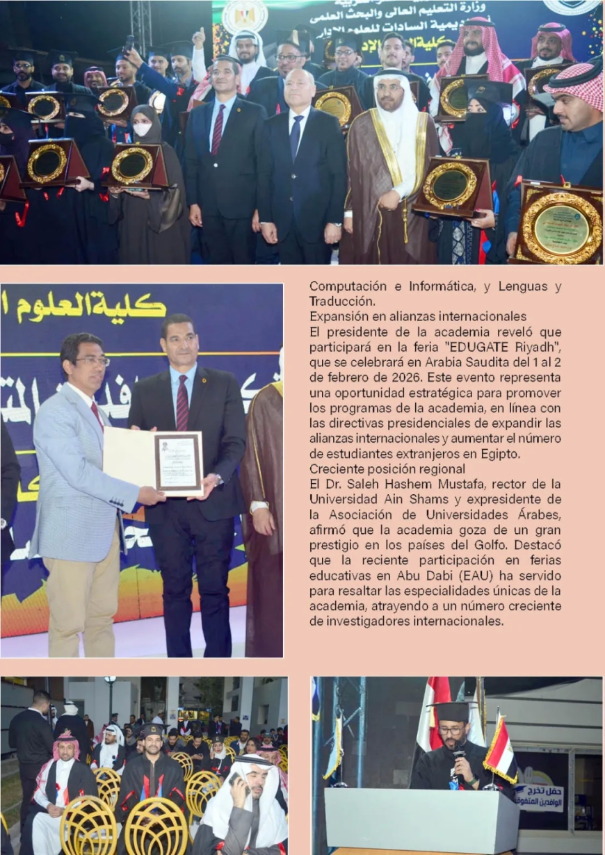 El Dr. Saleh Hashem Mustafa, rector de la Universidad Ain Shams y expresidente de la Asociación de Universidades Árabes, afirmó que la academia goza de un gran prestigio en los países del Golfo. Destacó que la reciente participación en ferias educativas en Abu Dabi (EAU) ha servido para resaltar las especialidades únicas de la academia, atrayendo a un número creciente de investigadores internacionales.