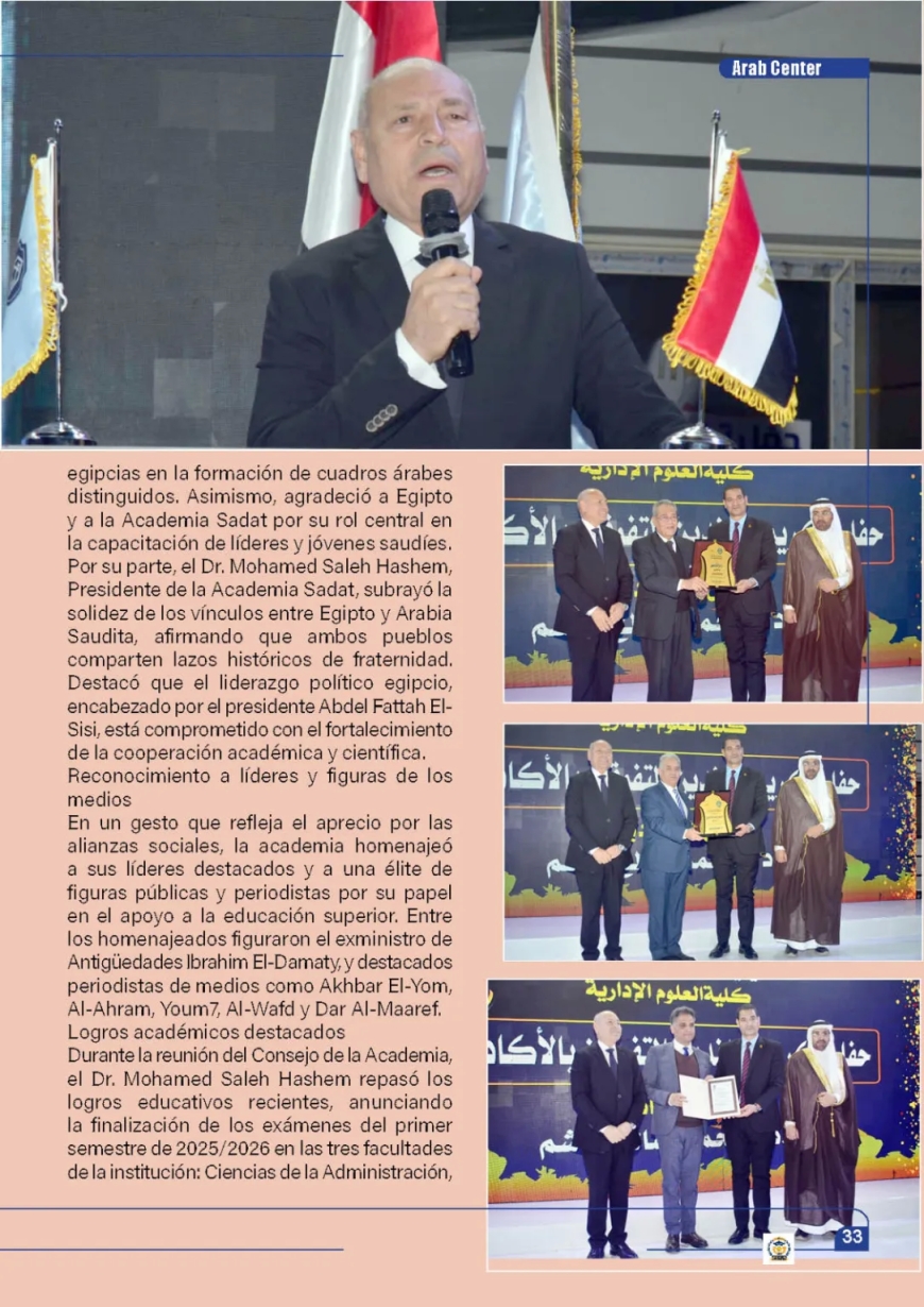 El Dr. Fahd Matar Al-Zabran, Agregado Cultural Adjunto de la Embajada de Arabia Saudita, pronunció un discurso en representación del Consejero Cultural, Dr. Mansour Al-Khathlan. En él, destacó la profundidad de las relaciones educativas entre ambos países y elogió el papel pionero de las instituciones académicas egipcias en la formación de cuadros árabes distinguidos. Asimismo, agradeció a Egipto y a la Academia Sadat por su rol central en la capacitación de líderes y jóvenes saudíes.