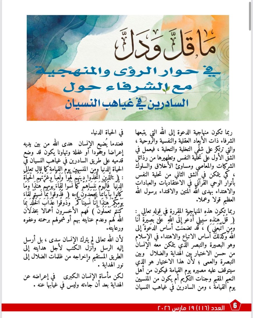 Este número incluye un profundo análisis del artículo del pensador árabe, el Sr. Ali Mohamed Al-Shurafa Al-Hammadi, titulado «Sumergidos en el legado» (Al-Gharíqun fil-Turath). El tratamiento editorial refleja la orientación de la revista hacia la apertura de un debate intelectual serio sobre cuestiones de conciencia religiosa, la autoridad del Noble Corán y los límites de la relación entre el texto divino y el legado humano, analizando su impacto en la realidad contemporánea de los musulmanes.